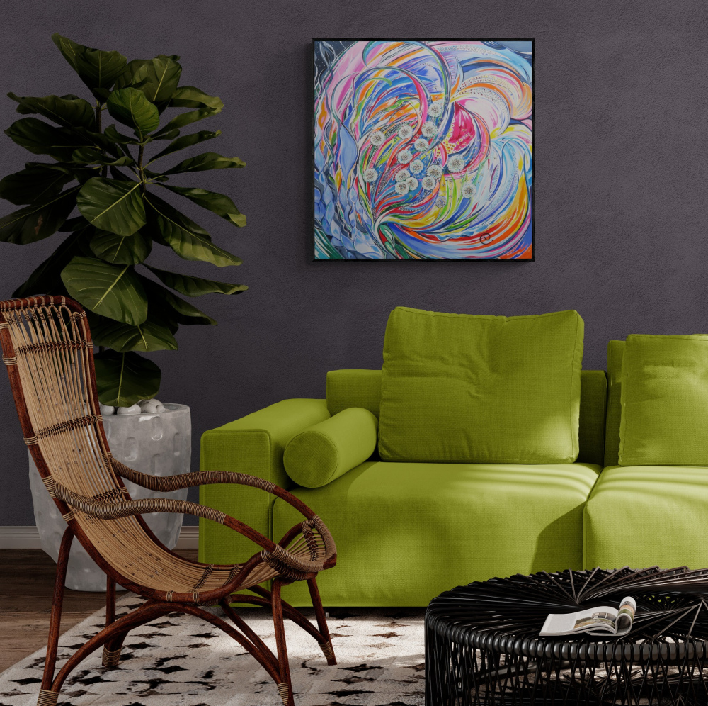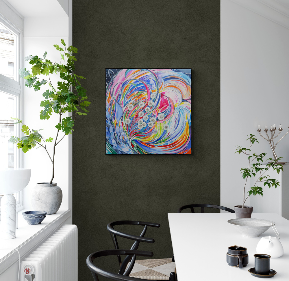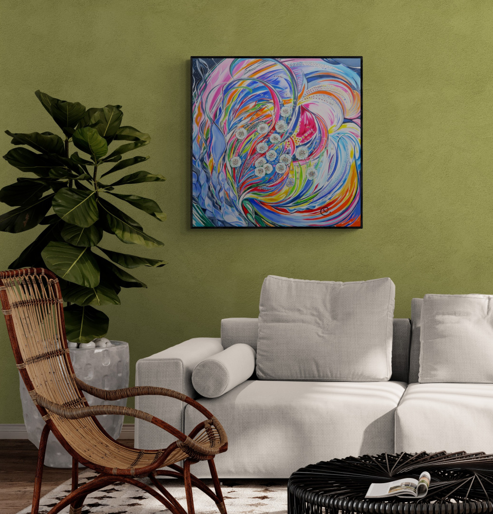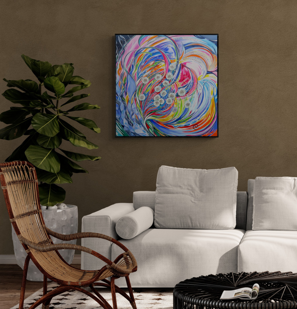 Les bords de l'œuvre sont peints pour un rendu esthétique, un châssis n'est donc pas nécessaire.